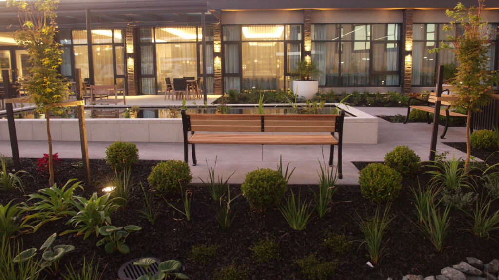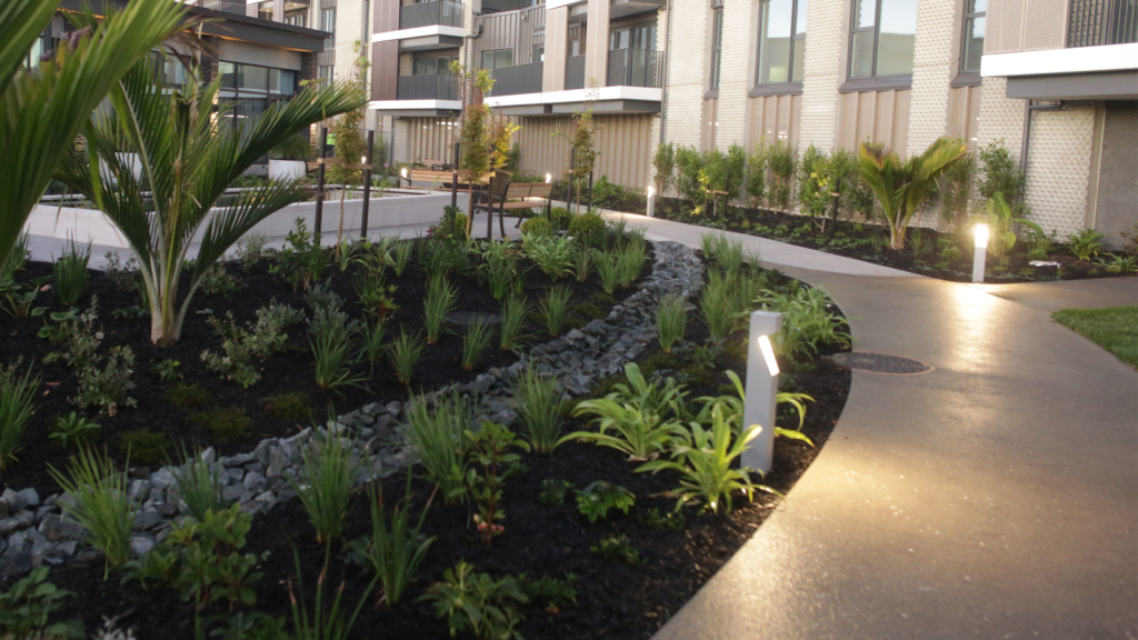 With the build on a very tight timeline and the site surrounded by multiple high-rise projects, a fully operational retirement village, the project was logistically challenging. To avoid resident disruption the site access was limited, and the GreensceneNZ Landscapes team managed the site skillfully with as low touch and disruption as possible. The results are exceptional for our client, their staff, and residents of Gulf Rise.
