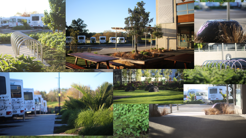 With large-grade trees and thoughtfully integrated green spaces, the landscape delivers a high level of amenity and a world-class arrival experience. Visitors to the campus are welcomed by an exterior showroom of brand-new motorhomes and expansive RV storage for over 500 vehicles — all set within a landscape that honours New Zealand’s natural beauty and cultural heritage.
